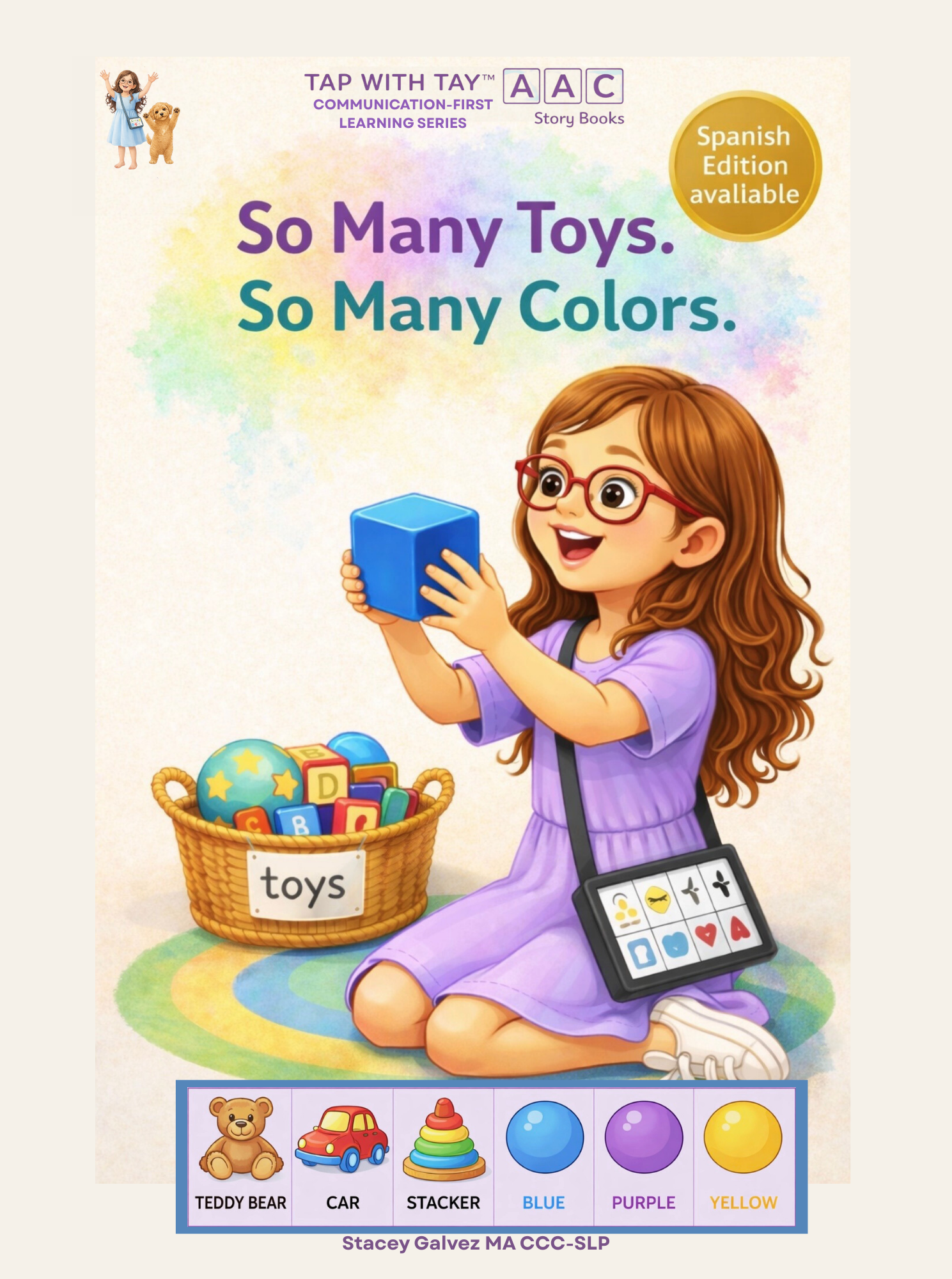 So Many Toys. So Many Colors. is an AAC-inclusive story designed with minimal navigation in mind for high-tech AAC users. Communication partners can model language while staying within the same folder—focusing on toys, colors, or simple actions—without needing to move across multiple pages. Readers may choose to read the story as written or model only what feels manageable. A low-tech AAC grid for toys and colors is included in the back to support communication anywhere.