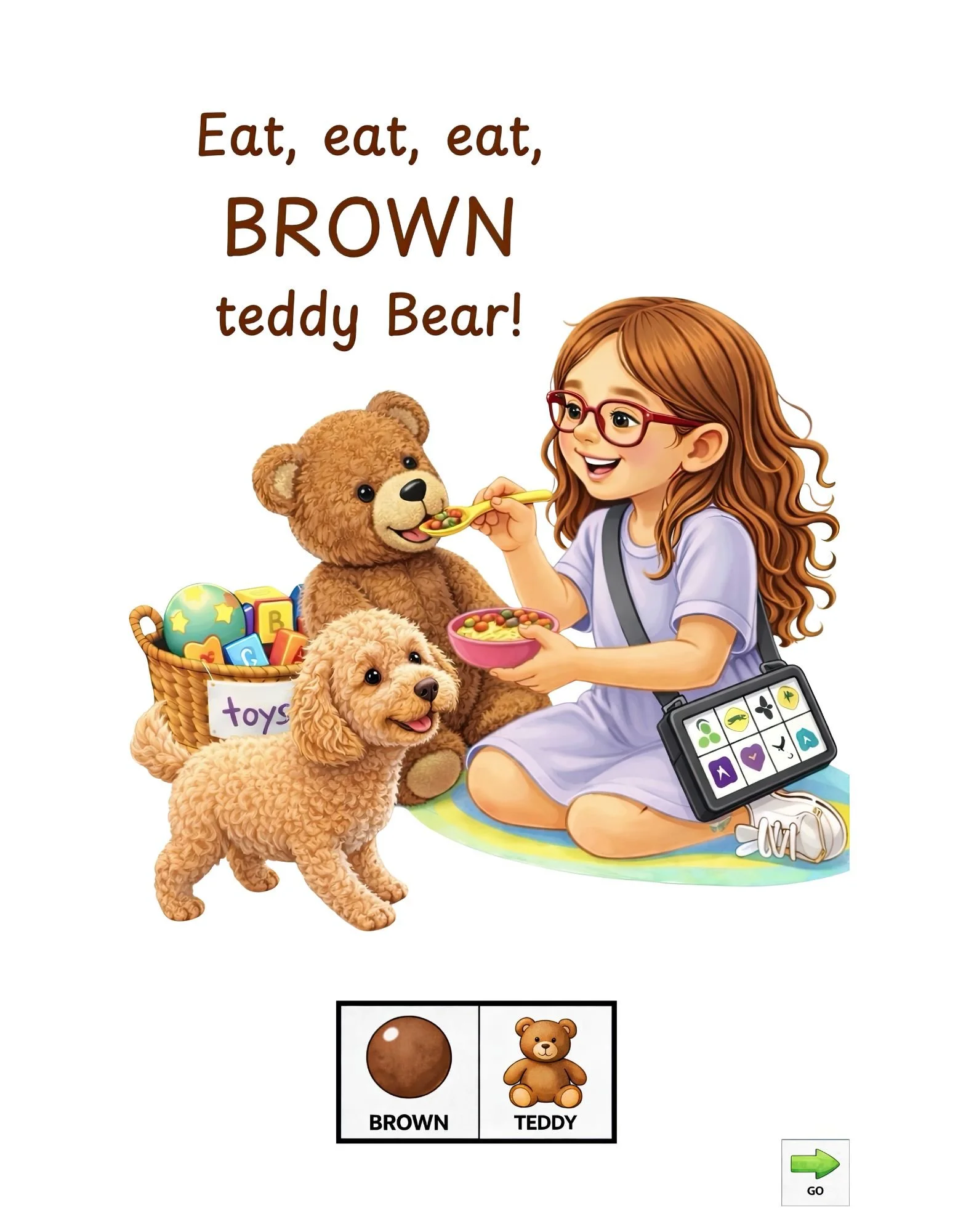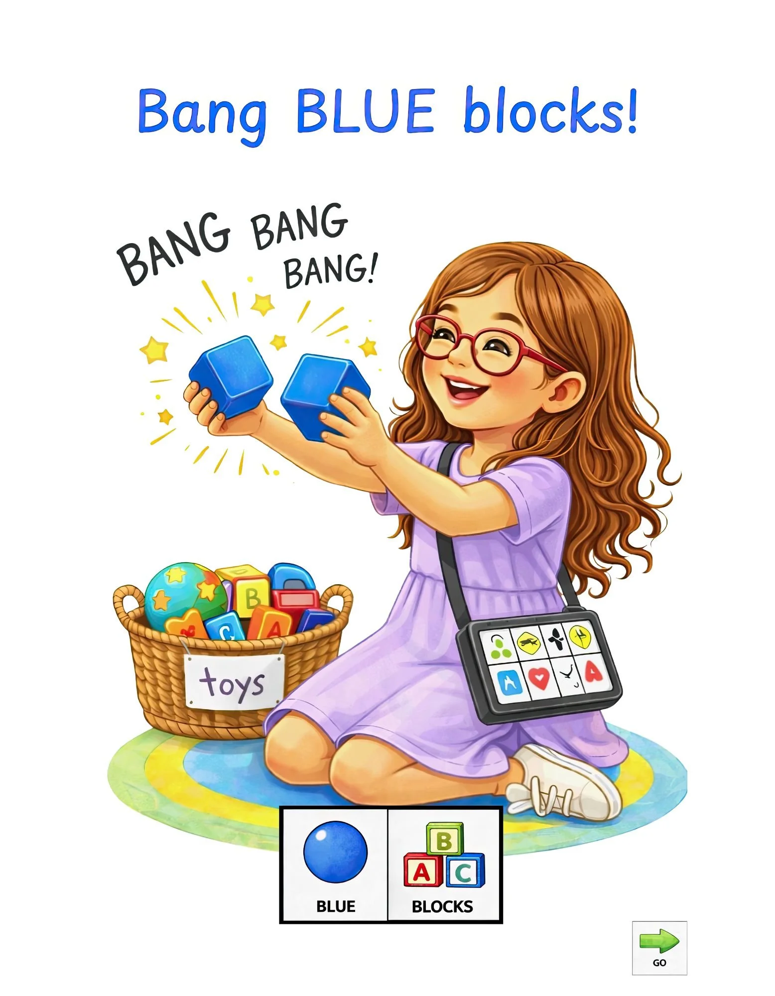Each page follows a predictable pattern—a color is named, a toy is introduced, and an action follows—making it easy for communication partners to model language in a way that feels natural and accessible. Readers can choose to model only toys, only colors, only actions, or any combination, depending on what works best for the communicator.